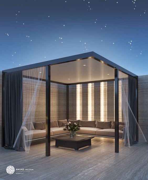 الإضاءة: إضافة إضاءة ليلية حول المسبح يمكن أن تضفي جوًا رائعًا وساحرًا للمكان، وتزيد من الأمان عند استخدام المسبح في الليل.